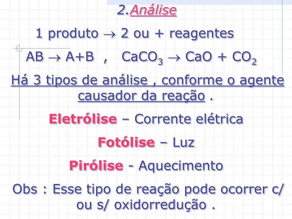 2.Análise 1 produto 2 ou + reagentes AB A+B , CaCO3 CaO + CO2 Há 3 tipos de análise , conforme o agente causador da reação . Eletrólise – Corrente elétrica Fotólise – Luz Pirólise- Aquecimento Obs : Esse tipo de reação pode ocorrer c/ ou s/ oxidorredução .