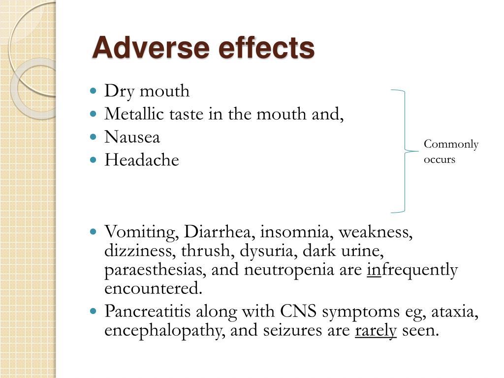Adverse effects • Dry mouth • Metallic taste in the mouth and, • Nausea • Headache • Vomiting, Diarrhea, insomnia, weakness, dizziness, thrush, dysuria, dark urine, paraesthesias, and neutropenia are infrequently encountered. • Pancreatitis along with CNS symptoms eg, ataxia, encephalopathy, and seizures are rarely seen. Commonly occurs