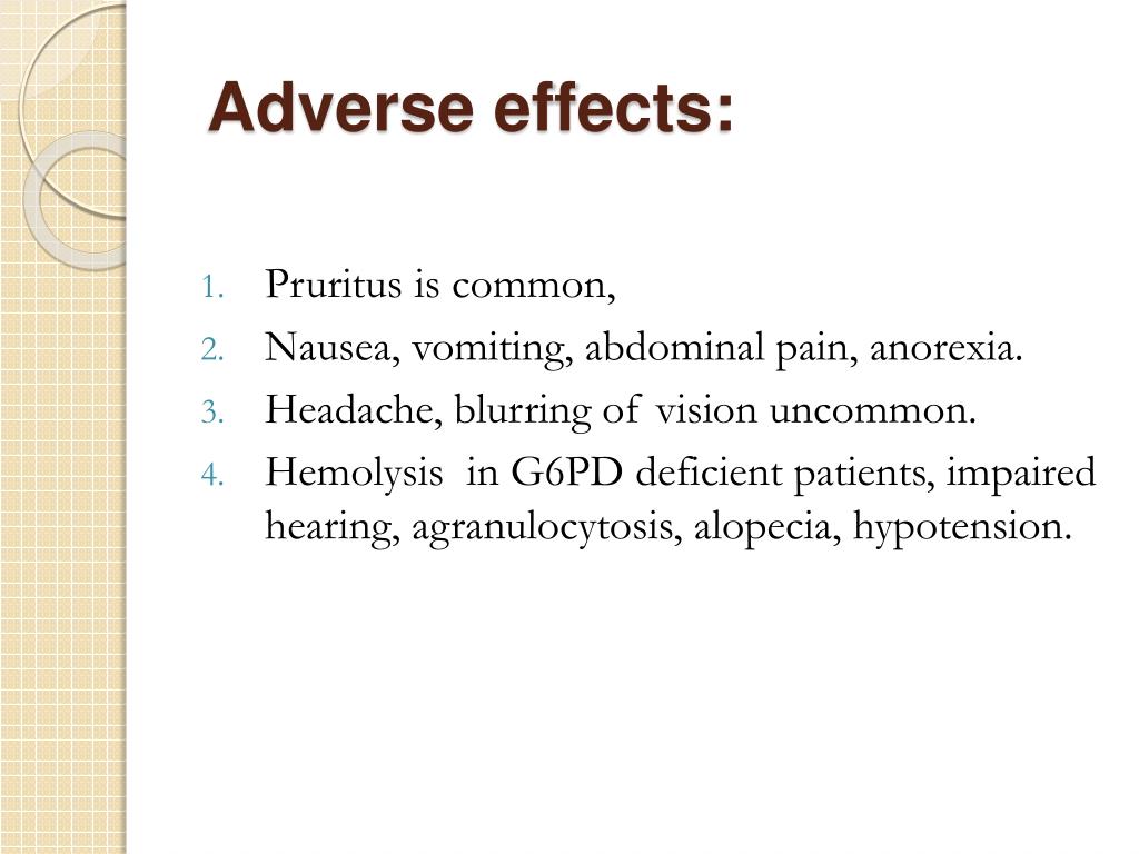 Adverse effects: • Pruritus is common, • Nausea, vomiting, abdominal pain, anorexia. • Headache, blurring of vision uncommon. • Hemolysis in G6PD deficient patients, impaired hearing, agranulocytosis, alopecia, hypotension.