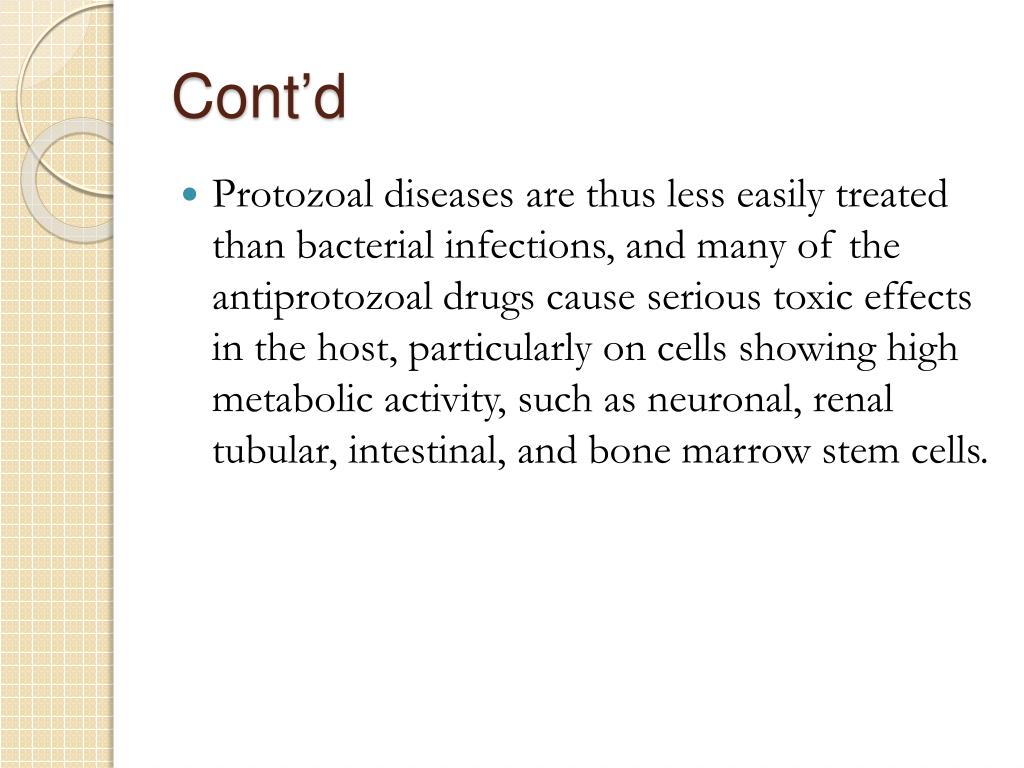 Cont’d • Protozoal diseases are thus less easily treated than bacterial infections, and many of the antiprotozoal drugs cause serious toxic effects in the host, particularly on cells showing high metabolic activity, such as neuronal, renal tubular, intestinal, and bone marrow stem cells.