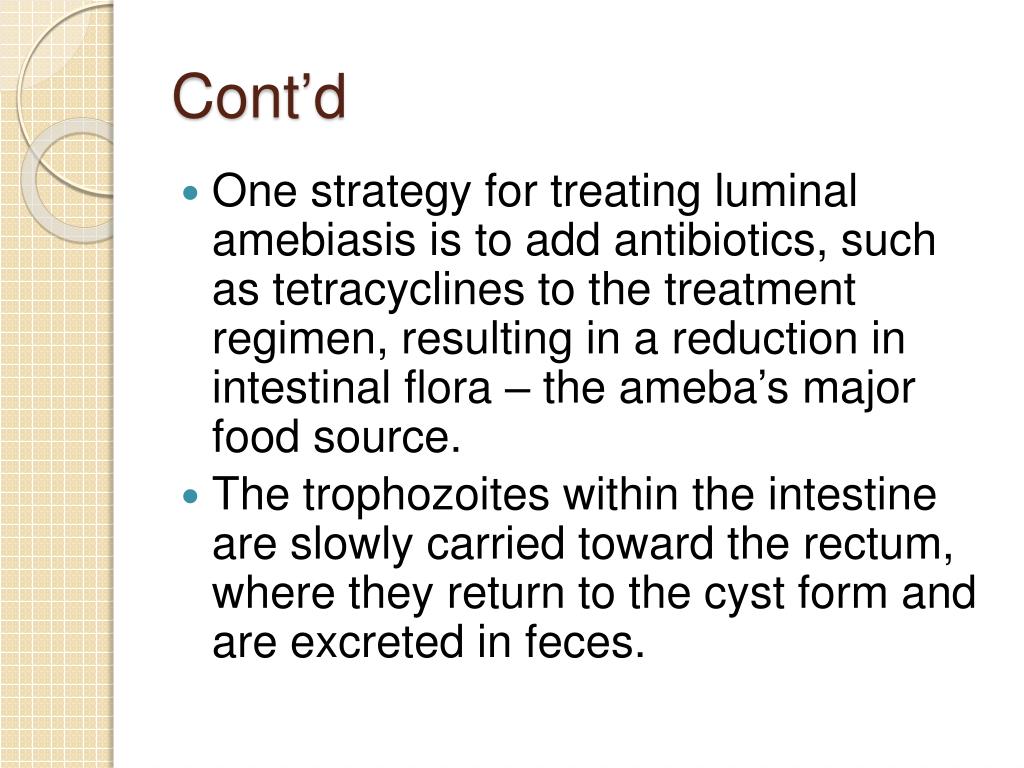 Cont’d • One strategy for treating luminal amebiasis is to add antibiotics, such as tetracyclines to the treatment regimen, resulting in a reduction in intestinal flora – the ameba’s major food source. • The trophozoites within the intestine are slowly carried toward the rectum, where they return to the cyst form and are excreted in feces.