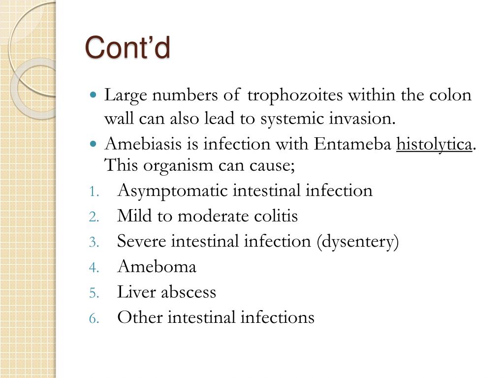 Cont’d • Large numbers of trophozoites within the colon wall can also lead to systemic invasion. • Amebiasis is infection with Entamebahistolytica. This organism can cause; • Asymptomatic intestinal infection • Mild to moderate colitis • Severe intestinal infection (dysentery) • Ameboma • Liver abscess • Other intestinal infections
