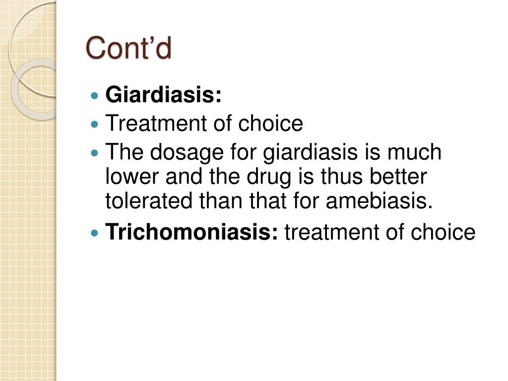 Cont’d • Giardiasis: • Treatment of choice • The dosage for giardiasis is much lower and the drug is thus better tolerated than that for amebiasis. • Trichomoniasis: treatment of choice