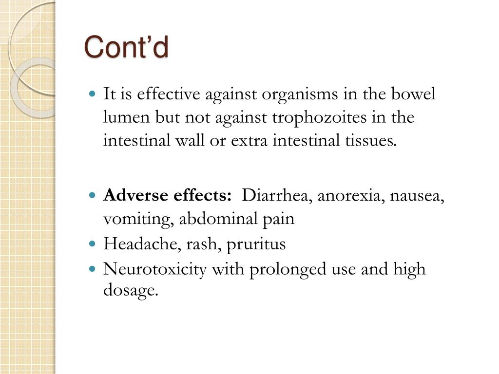 Cont’d • It is effective against organisms in the bowel lumen but not against trophozoites in the intestinal wall or extra intestinal tissues. • Adverse effects: Diarrhea, anorexia, nausea, vomiting, abdominal pain • Headache, rash, pruritus • Neurotoxicity with prolonged use and high dosage.