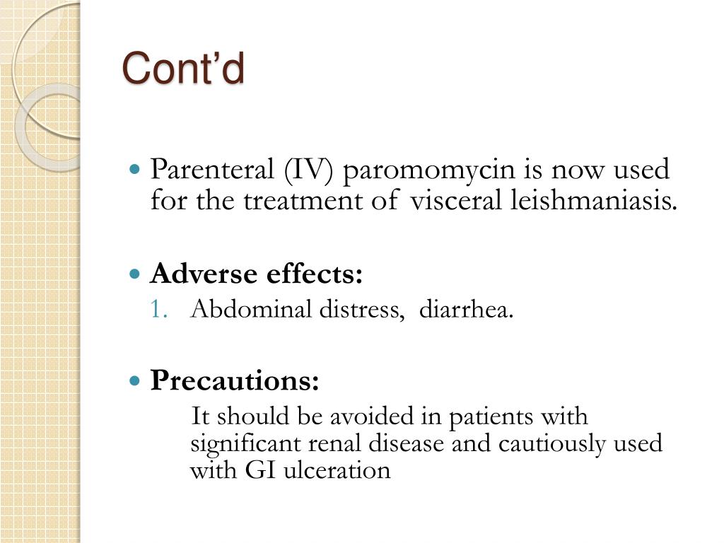 Cont’d • Parenteral (IV) paromomycin is now used for the treatment of visceral leishmaniasis. • Adverse effects: • Abdominal distress, diarrhea. • Precautions: It should be avoided in patients with significant renal disease and cautiously used with GI ulceration