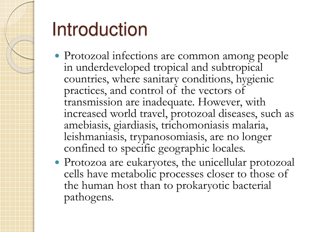 Introduction • Protozoal infections are common among people in underdeveloped tropical and subtropical countries, where sanitary conditions, hygienic practices, and control of the vectors of transmission are inadequate. However, with increased world travel, protozoal diseases, such as amebiasis, giardiasis, trichomoniasis malaria, leishmaniasis, trypanosomiasis, are no longer confined to specific geographic locales. • Protozoa are eukaryotes, the unicellular protozoal cells have metabolic processes closer to those of the human host than to prokaryotic bacterial pathogens.