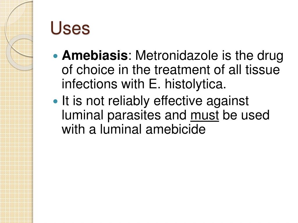 Uses • Amebiasis: Metronidazole is the drug of choice in the treatment of all tissue infections with E. histolytica. • It is not reliably effective against luminal parasites and must be used with a luminal amebicide