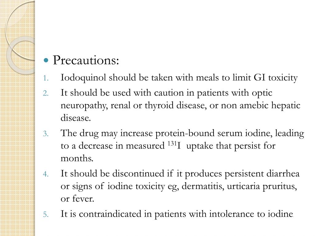 Precautions: • Iodoquinol should be taken with meals to limit GI toxicity • It should be used with caution in patients with optic neuropathy, renal or thyroid disease, or non amebic hepatic disease. • The drug may increase protein-bound serum iodine, leading to a decrease in measured 131I uptake that persist for months. • It should be discontinued if it produces persistent diarrhea or signs of iodine toxicity eg, dermatitis, urticariapruritus, or fever. • It is contraindicated in patients with intolerance to iodine.