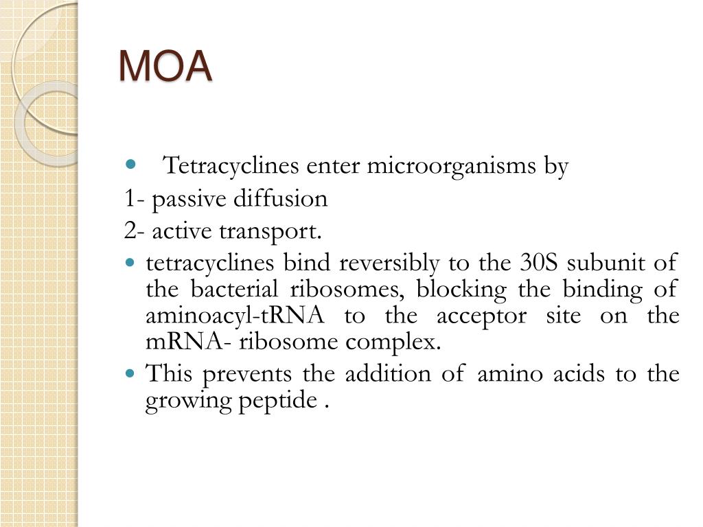 MOA • Tetracyclines enter microorganisms by 1- passive diffusion 2- active transport. • tetracyclines bind reversibly to the 30S subunit of the bacterial ribosomes, blocking the binding of aminoacyl-tRNA to the acceptor site on the mRNA- ribosome complex. • This prevents the addition of amino acids to the growing peptide .