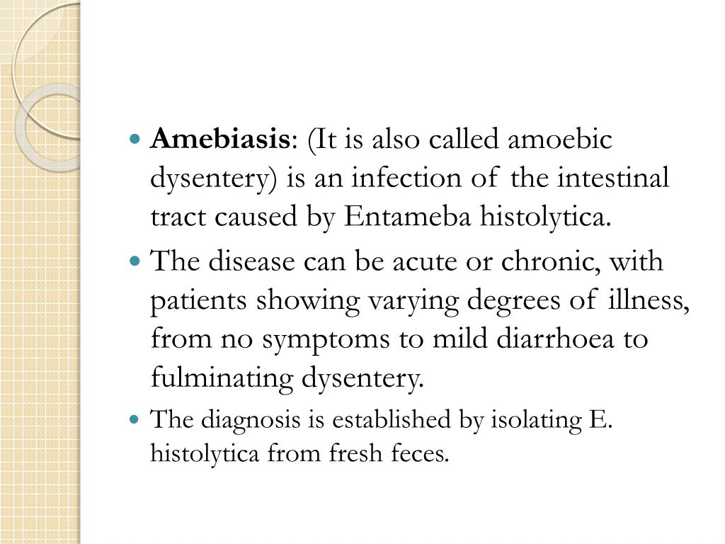 Amebiasis: (It is also called amoebic dysentery) is an infection of the intestinal tract caused by Entamebahistolytica. • The disease can be acute or chronic, with patients showing varying degrees of illness, from no symptoms to mild diarrhoea to fulminating dysentery. • The diagnosis is established by isolating E. histolytica from fresh feces.