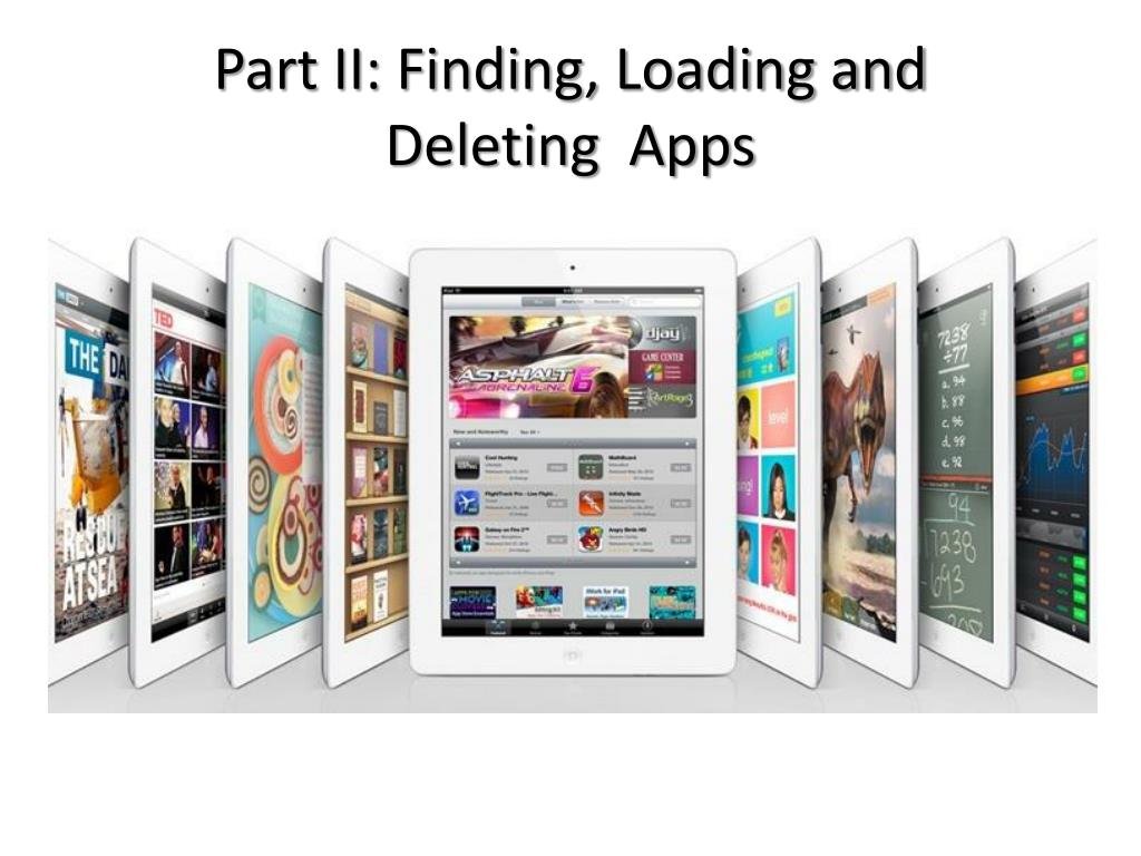 Deleting Apps • To delete an app, tap and hold the app until it wiggles and the black “x” appears. • Tap the icon again. • Tap delete. • Tap the home button to stop the “wiggling.”
