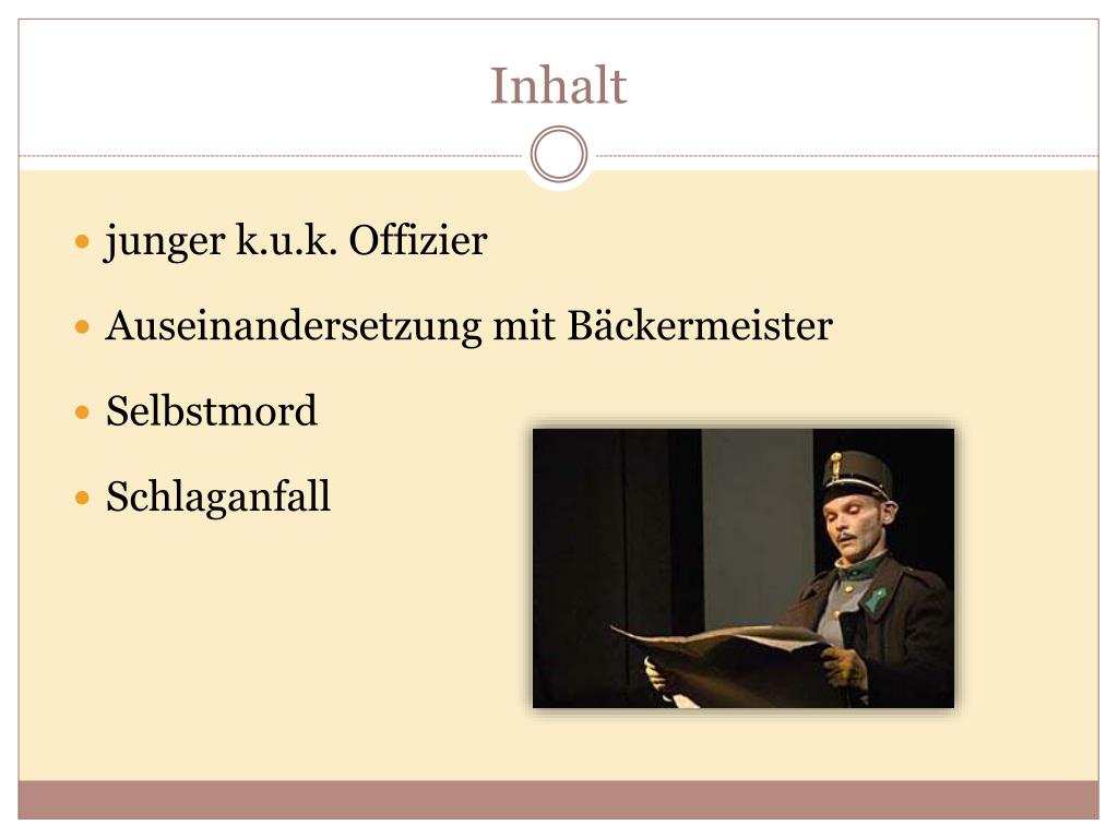 Inhalt junger k.u.k. Offizier Auseinandersetzung mit Bäckermeister Selbstmord Schlaganfall