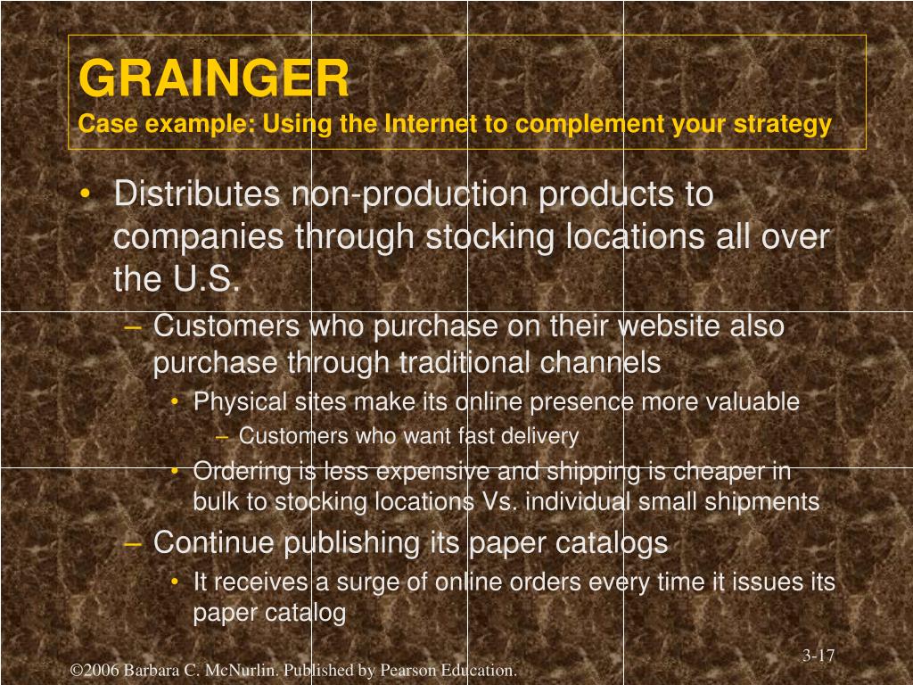 GRAINGERCase example: Using the Internet to complement your strategy • Distributes non-production products to companies through stocking locations all over the U.S. • Customers who purchase on their website also purchase through traditional channels • Physical sites make its online presence more valuable • Customers who want fast delivery • Ordering is less expensive and shipping is cheaper in bulk to stocking locations Vs. individual small shipments • Continue publishing its paper catalogs • It receives a surge of online orders every time it issues its paper catalog