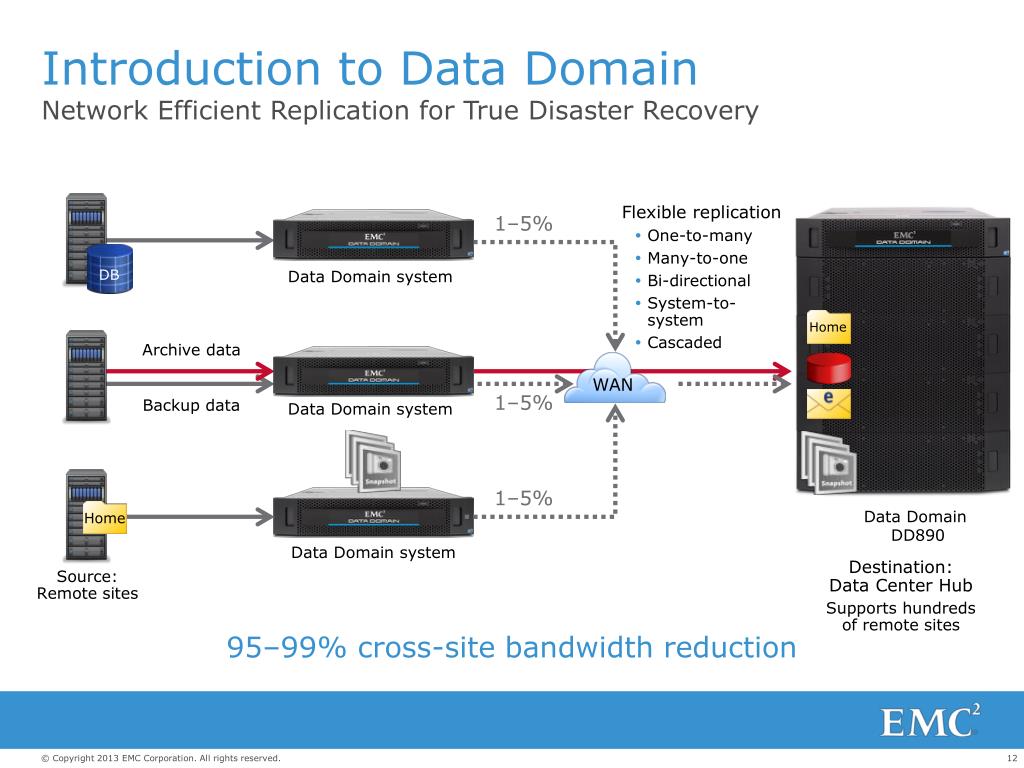 WAN Home Home Introduction to Data Domain Network Efficient Replication for True Disaster Recovery • Flexible replication • One-to-many • Many-to-one • Bi-directional • System-to-system • Cascaded 1–5% DB Data Domain system Archive data 1–5% Backup data Data Domain system 1–5% Data Domain DD890 Data Domain system Destination: Data Center Hub Supports hundreds of remote sites Source: Remote sites 95–99% cross-site bandwidth reduction