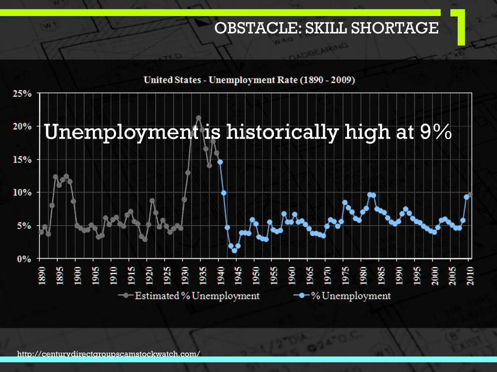 OBSTACLE: SKILL SHORTAGE Unemployment is historically high at 9% http://centurydirectgroupscamstockwatch.com/