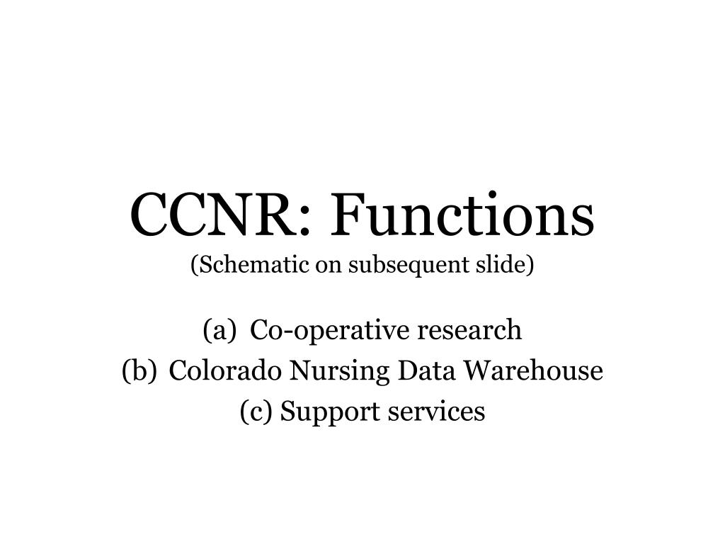 CCNR: Functions(Schematic on subsequent slide) Co-operative research Colorado Nursing Data Warehouse (c) Support services
