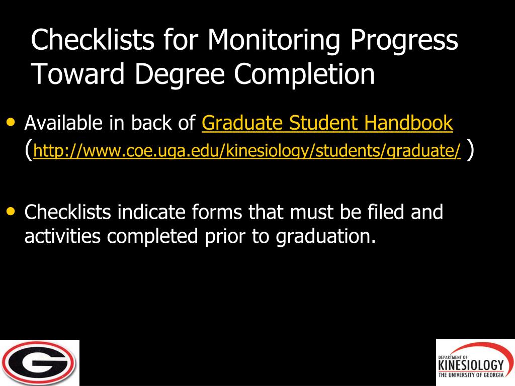 Checklists for Monitoring Progress Toward Degree Completion • Available in back of Graduate Student Handbook(http://www.coe.uga.edu/kinesiology/students/graduate/) • Checklists indicate forms that must be filed and activities completed prior to graduation.