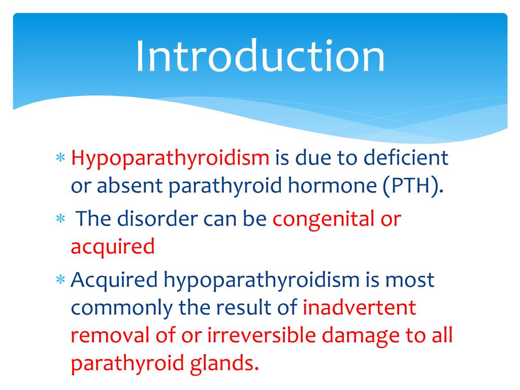 Introduction Hypoparathyroidism is due to deficient or absent parathyroid hormone (PTH). The disorder can be congenital or acquired Acquired hypoparathyroidism is most commonly the result of inadvertent removal of or irreversible damage to all parathyroid glands.