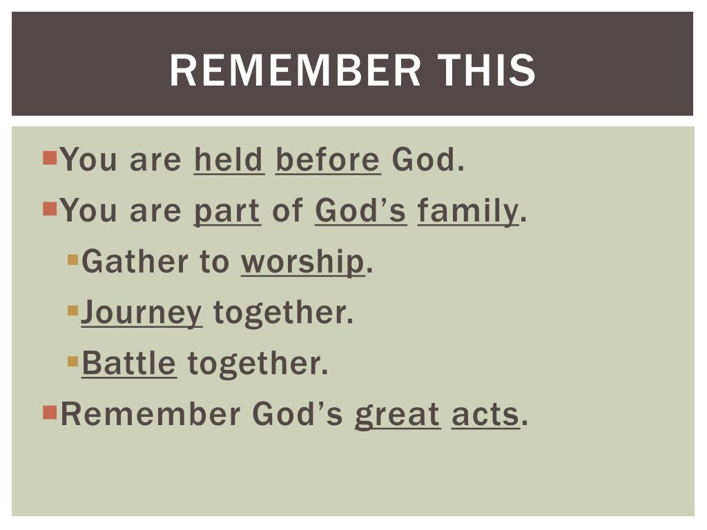 Remember This • You are heldbefore God. • You are part of God’sfamily. • Gather to worship. • Journey together. • Battle together. • Remember God’s greatacts.
