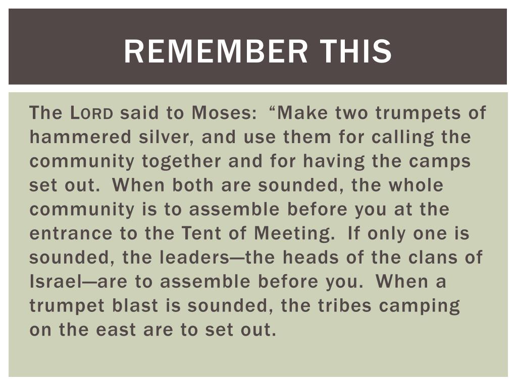 Remember This The Lord said to Moses: “Make two trumpets of hammered silver, and use them for calling the community together and for having the camps set out. When both are sounded, the whole community is to assemble before you at the entrance to the Tent of Meeting. If only one is sounded, the leaders—the heads of the clans of Israel—are to assemble before you. When a trumpet blast is sounded, the tribes camping on the east are to set out.