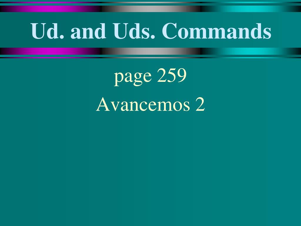 Ud. and Uds. Commands. page 259 Avancemos 2. Ud. and Uds. Commands. To give an affirmative or negative command in the Ud. or Uds. form, use the present-tense yo form as the stem. Then drop the “o” and add the following endings. Ud. and Uds. Commands. Add -e or -en for -ar verbs.