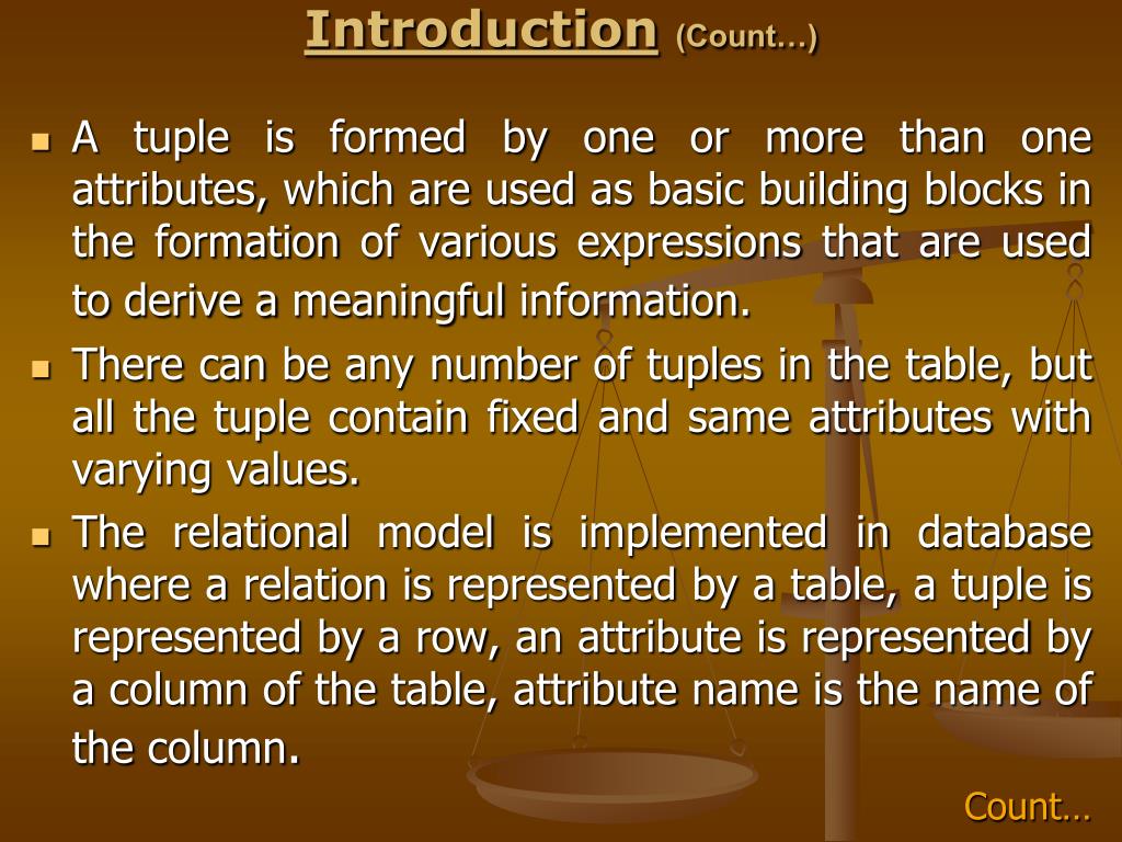 Introduction(Count…) • A tuple is formed by one or more than one attributes, which are used as basic building blocks in the formation of various expressions that are used to derive a meaningful information. • There can be any number of tuples in the table, but all the tuple contain fixed and same attributes with varying values. • The relational model is implemented in database where a relation is represented by a table, a tuple is represented by a row, an attribute is represented by a column of the table, attribute name is the name of the column. Count…