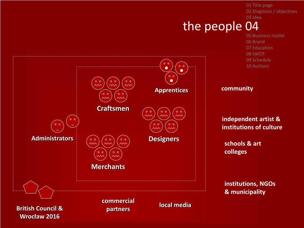 Administrators 01 Title page02 Diagnosis / objectives03 Idea 05 Business model06 Brand07 Education08 SWOT09 Schedule10 Authors the people 04 commercial partners community Apprentices Craftsmen independent artist & institutions of culture schools & art colleges Designers Merchants institutions, NGOs & municipality local media British Council & Wrocław 2016
