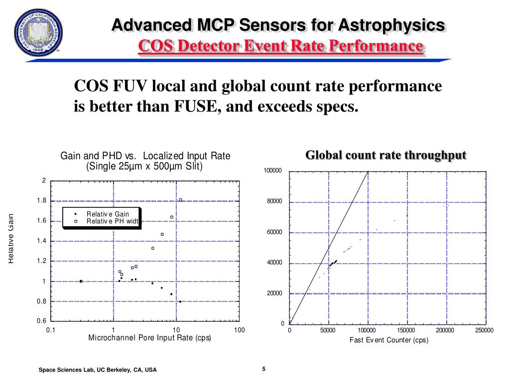 Advanced MCP Sensors for AstrophysicsCOS Detector Event Rate Performance COS FUV local and global count rate performance is better than FUSE, and exceeds specs. Global count rate throughput