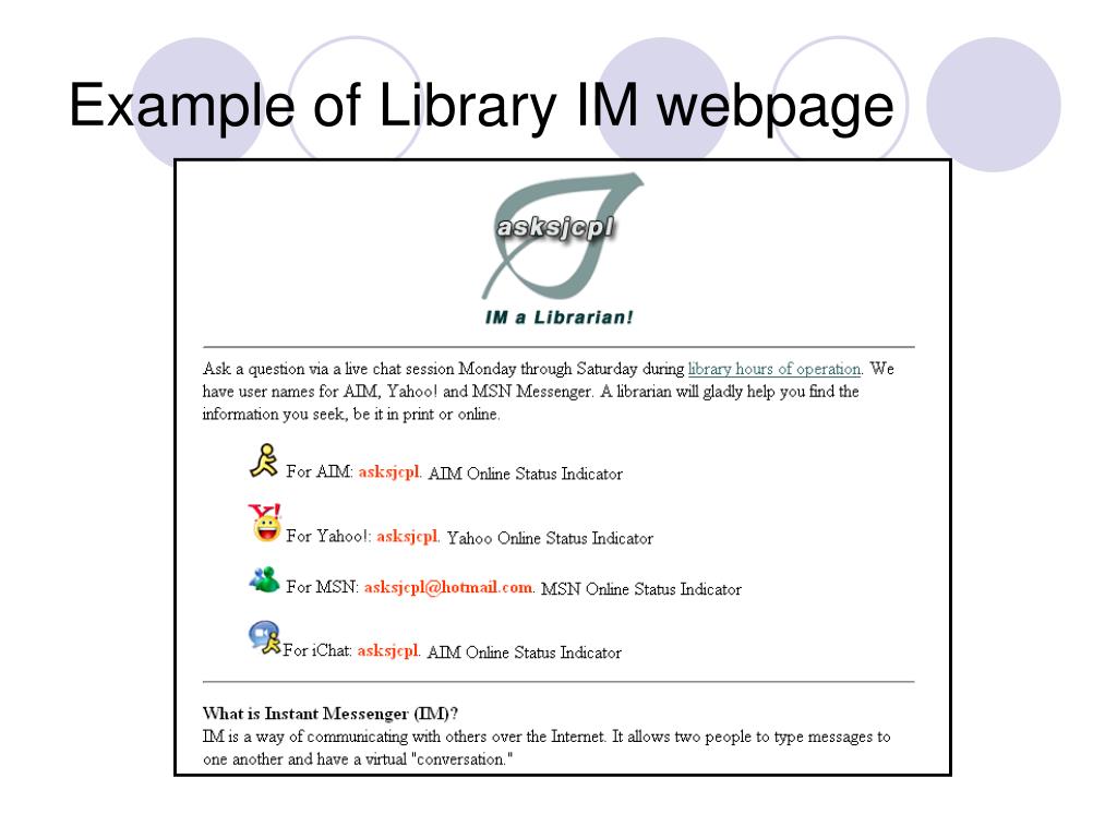 Concerns to address • If user not already IMing, needs to download a small program • Library needs to actively secure user information (not keeping transcripts, buddy lists) • Commercial chat terms of service may include privacy concerns…warn users • No co-browsing…yet • No 24/7 availability…yet