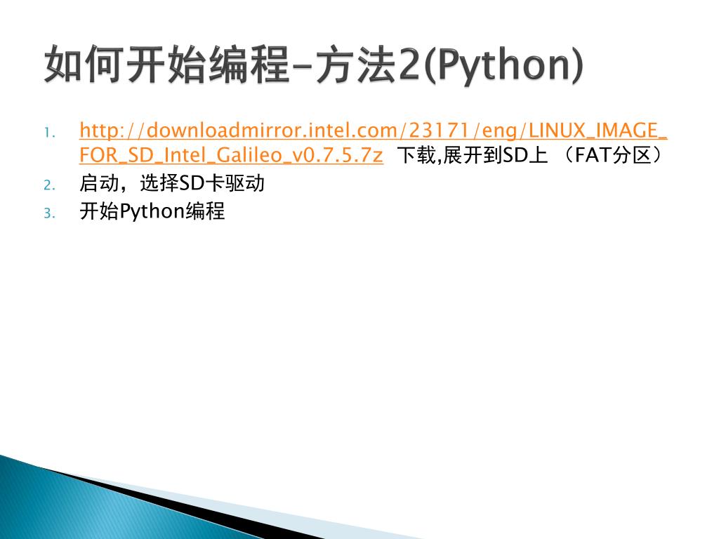 如何开始编程-方法2(Python) • http://downloadmirror.intel.com/23171/eng/LINUX_IMAGE_FOR_SD_Intel_Galileo_v0.7.5.7z下载,展开到SD上 (FAT分区) • 启动,选择SD卡驱动 • 开始Python编程