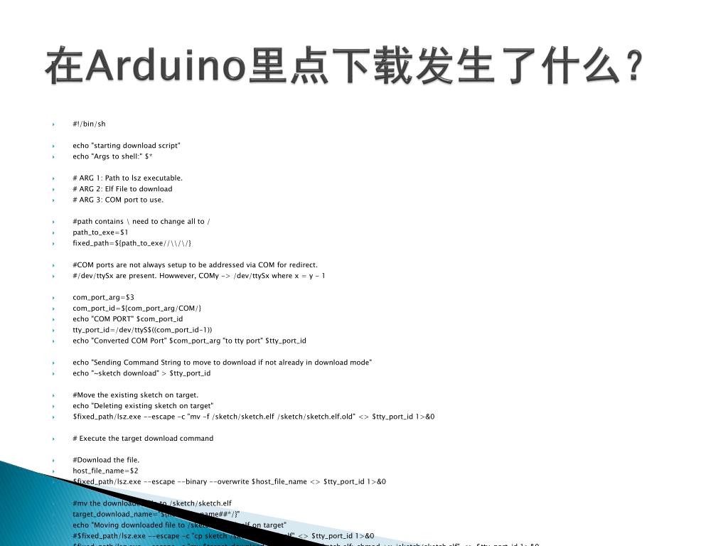 在Arduino里点下载发生了什么? • #!/bin/sh • echo "starting download script" • echo "Args to shell:" $* • # ARG 1: Path to lsz executable. • # ARG 2: Elf File to download • # ARG 3: COM port to use. • #path contains \ need to change all to / • path_to_exe=$1 • fixed_path=${path_to_exe//\\/\/} • #COM ports are not always setup to be addressed via COM for redirect. • #/dev/ttySx are present. Howwever, COMy -> /dev/ttySx where x = y - 1 • com_port_arg=$3 • com_port_id=${com_port_arg/COM/} • echo "COM PORT" $com_port_id • tty_port_id=/dev/ttyS$((com_port_id-1)) • echo "Converted COM Port" $com_port_arg "to tty port" $tty_port_id • echo "Sending Command String to move to download if not already in download mode" • echo "~sketch download" > $tty_port_id • #Move the existing sketch on target. • echo "Deleting existing sketch on target" • $fixed_path/lsz.exe --escape -c "mv -f /sketch/sketch.elf /sketch/sketch.elf.old" <> $tty_port_id 1>&0 • # Execute the target download command • #Download the file. • host_file_name=$2 • $fixed_path/lsz.exe --escape --binary --overwrite $host_file_name <> $tty_port_id 1>&0 • #mv the downloaded file to /sketch/sketch.elf • target_download_name="${host_file_name##*/}" • echo "Moving downloaded file to /sketch/sketch.elf on target" • #$fixed_path/lsz.exe --escape -c "cp sketch /sketch/sketch.elf" <> $tty_port_id 1>&0 • $fixed_path/lsz.exe --escape -c "mv $target_download_name /sketch/sketch.elf; chmod +x /sketch/sketch.elf" <> $tty_port_id 1>&0