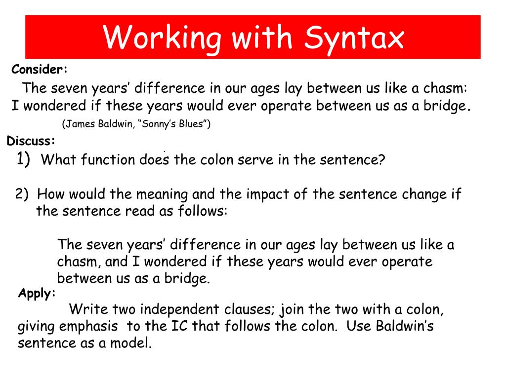 Working with Syntax Consider: The seven years’ difference in our ages lay between us like a chasm: I wondered if these years would ever operate between us as a bridge. (James Baldwin, “Sonny’s Blues”) . Discuss: 1) What function does the colon serve in the sentence? 2) How would the meaning and the impact of the sentence change if the sentence read as follows: The seven years’ difference in our ages lay between us like a chasm, and I wondered if these years would ever operate between us as a bridge. Apply: Write two independent clauses; join the two with a colon, giving emphasis to the IC that follows the colon. Use Baldwin’s sentence as a model.