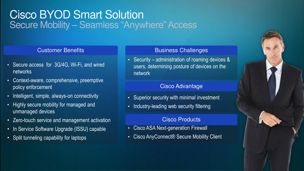 Cisco BYOD Smart SolutionSummary – Anywhere, Any Device, Any Time IT Employees CTO CEO Innovation Speed time to market Increase connectivity & productivity Drive new business models Maintain business relevance Attract & retain employees Increase agility