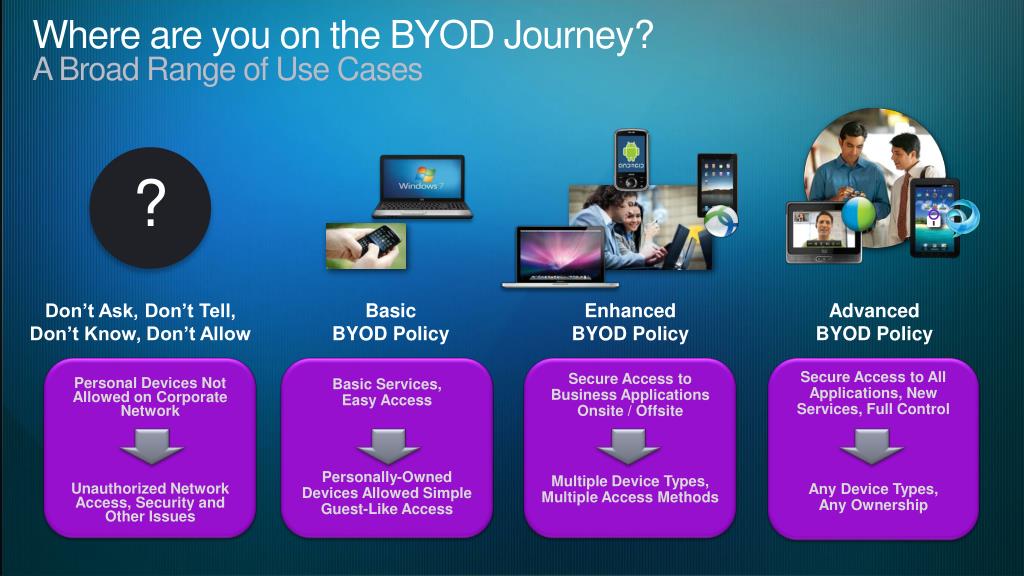 Where are you on the BYOD Journey?A Broad Range of Use Cases ? Don’t Ask, Don’t Tell, Don’t Know, Don’t Allow Basic BYOD Policy Enhanced BYOD Policy Advanced BYOD Policy Personal Devices Not Allowed on Corporate Network Unauthorized Network Access, Security and Other Issues • Basic Services,Easy Access • Personally-Owned Devices Allowed Simple Guest-Like Access • Secure Access to Business ApplicationsOnsite / Offsite • Multiple Device Types, Multiple Access Methods Secure Access to All Applications, New Services, Full Control Any Device Types, Any Ownership