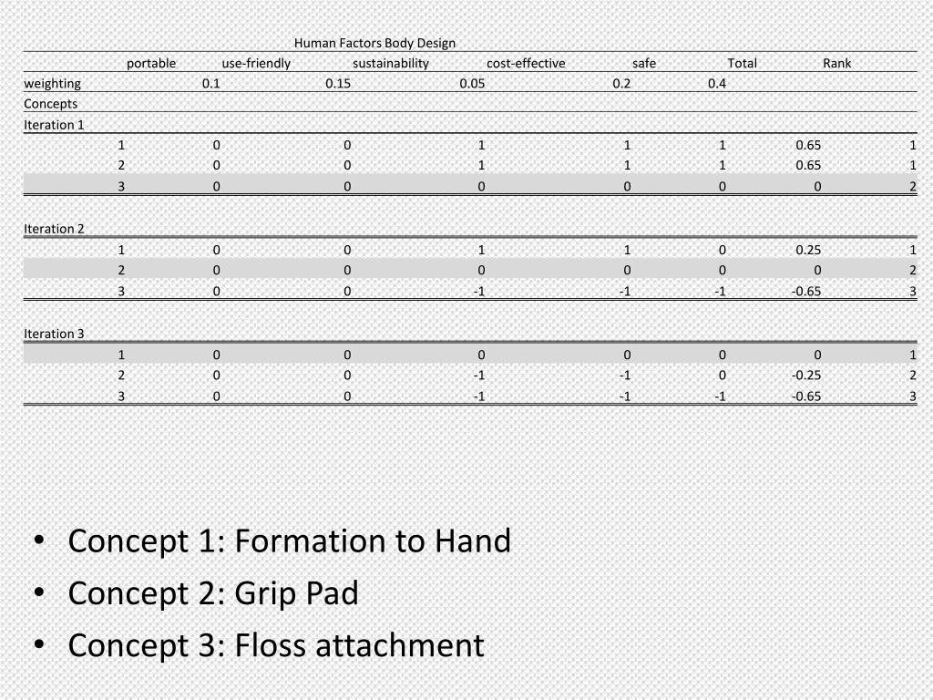 Concept 1: Formation to Hand • Concept 2: Grip Pad • Concept 3: Floss attachment