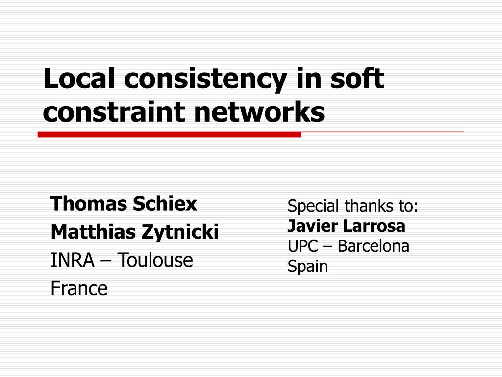 Local consistency in soft constraint networks Thomas Schiex Matthias Zytnicki INRA – Toulouse France Special thanks to: Javier Larrosa UPC – Barcelona Spain