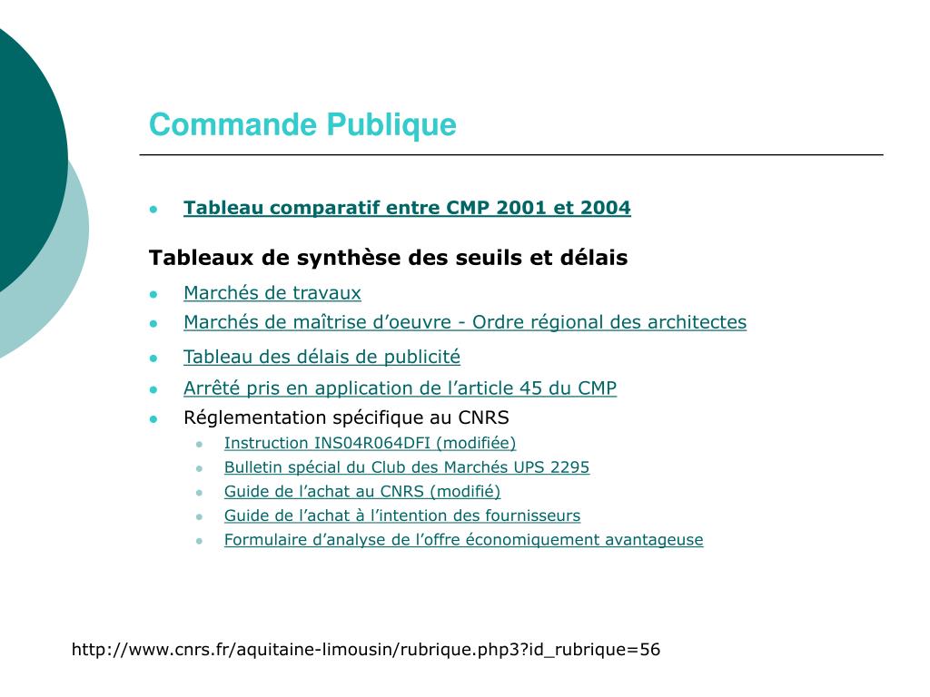 Commande Publique • Tableau comparatif entre CMP 2001 et 2004 Tableaux de synthèse des seuils et délais • Marchés de travaux • Marchés de maîtrise d’oeuvre - Ordre régional des architectes • Tableau des délais de publicité • Arrêté pris en application de l’article 45 du CMP • Réglementation spécifique au CNRS • Instruction INS04R064DFI (modifiée) • Bulletin spécial du Club des Marchés UPS 2295 • Guide de l’achat au CNRS (modifié) • Guide de l’achat à l’intention des fournisseurs • Formulaire d’analyse de l’offre économiquement avantageuse http://www.cnrs.fr/aquitaine-limousin/rubrique.php3?id_rubrique=56