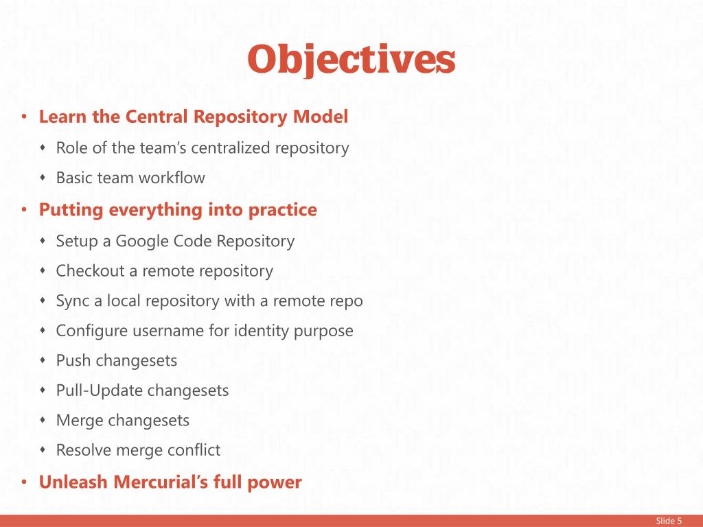 Objectives • Learn the Central Repository Model • Role of the team’s centralized repository • Basic team workflow • Putting everything into practice • Setup a Google Code Repository • Checkout a remote repository • Sync a local repository with a remote repo • Configure username for identity purpose • Push changesets • Pull-Update changesets • Merge changesets • Resolve merge conflict • Unleash Mercurial’s full power