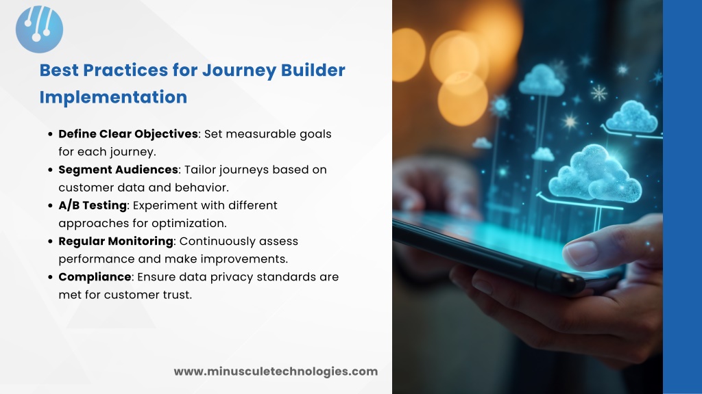 Best Practices for Journey Builder Implementation Define Clear Objectives: Set measurable goals for each journey. Segment Audiences: Tailor journeys based on customer data and behavior. A/B Testing: Experiment with different approaches for optimization. Regular Monitoring: Continuously assess performance and make improvements. Compliance: Ensure data privacy standards are met for customer trust. www.minusculetechnologies.com