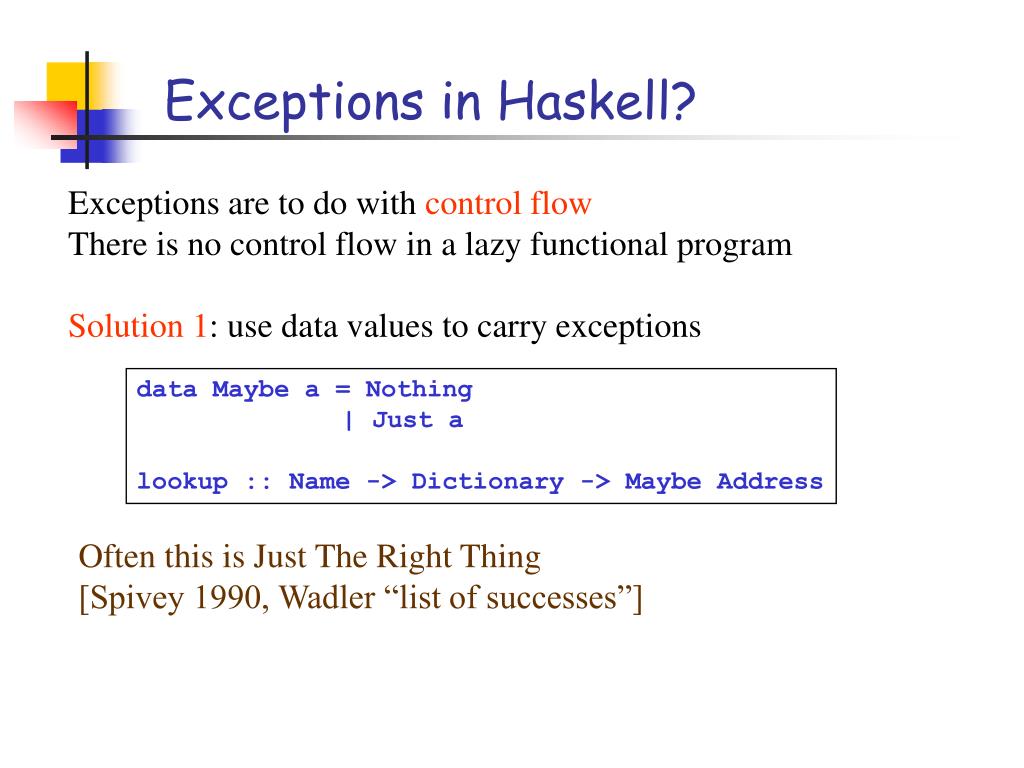 Exceptions in Haskell? Exceptions are to do with control flow There is no control flow in a lazy functional program Solution 1: use data values to carry exceptions data Maybe a = Nothing | Just a lookup :: Name -> Dictionary -> Maybe Address Often this is Just The Right Thing [Spivey 1990, Wadler “list of successes”]