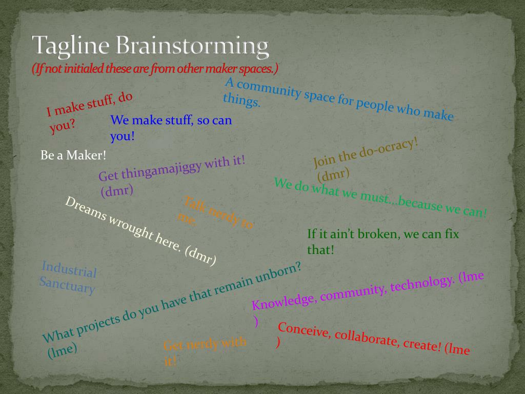 Tagline Brainstorming(If not initialed these are from other maker spaces.) I make stuff, do you? A community space for people who make things. We make stuff, so can you! Join the do-ocracy! (dmr) Be a Maker! Get thingamajiggy with it! (dmr) We do what we must…because we can! Talk nerdy to me. Dreams wrought here. (dmr) If it ain’t broken, we can fix that! Industrial Sanctuary Knowledge, community, technology. (lme ) What projects do you have that remain unborn? (lme) Conceive, collaborate, create! (lme ) Get nerdy with it!