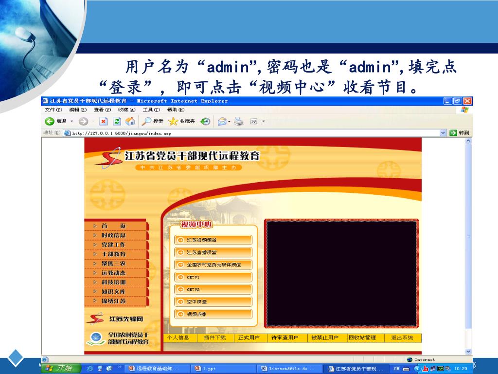 用户名为“admin”,密码也是“admin”,填完点“登录”,即可点击“视频中心”收看节目。 用户名为“admin”,密码也是“admin”,填完点“登录”,即可点击“视频中心”收看节目。 中共泗洪县委组织部