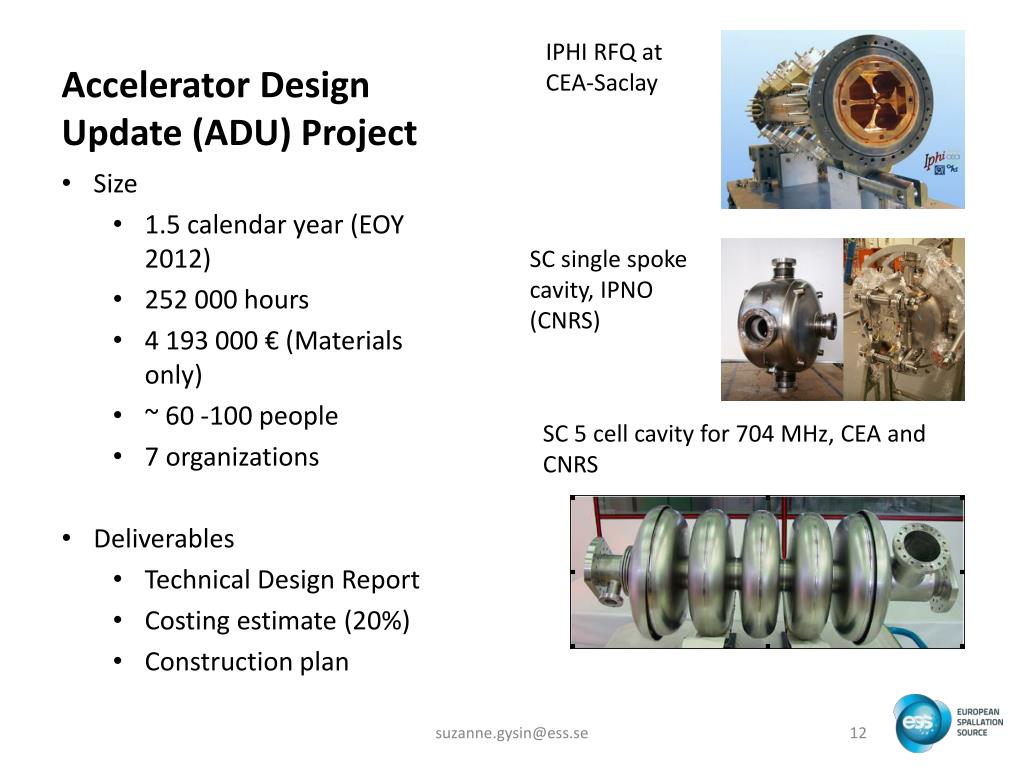 Accelerator Design Update (ADU) Project IPHI RFQ at CEA-Saclay Size 1.5 calendar year (EOY 2012) 252 000 hours 4 193 000 € (Materials only) ~ 60 -100 people 7 organizations Deliverables Technical Design Report Costing estimate (20%) Construction plan SC single spoke cavity, IPNO (CNRS) SC 5 cell cavity for 704 MHz, CEA and CNRS suzanne.gysin@ess.se