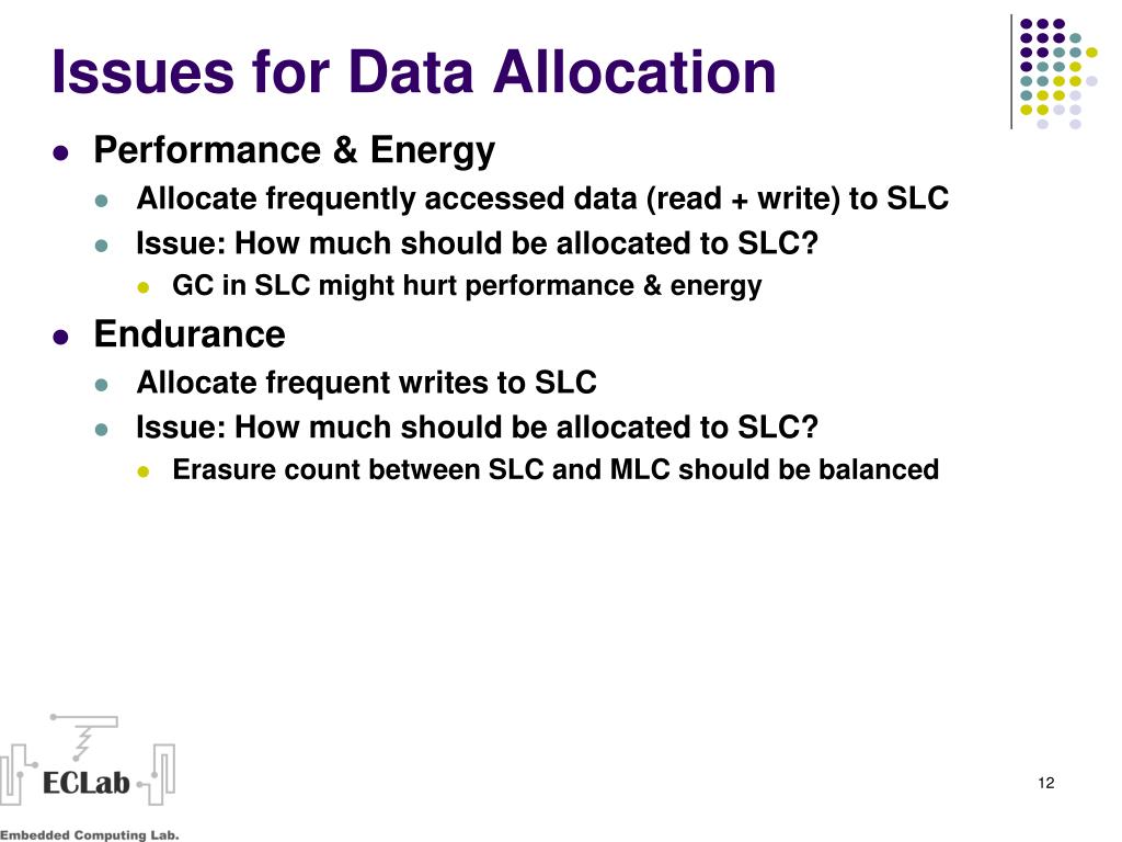 Issues for Data Allocation • Performance & Energy • Allocate frequently accessed data (read + write) to SLC • Issue: How much should be allocated to SLC? • GC in SLC might hurt performance & energy • Endurance • Allocate frequent writes to SLC • Issue: How much should be allocated to SLC? • Erasure count between SLC and MLC should be balanced