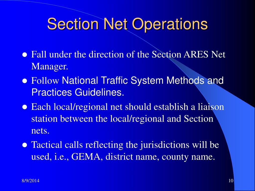 Section Net Operations • Fall under the direction of the Section ARES Net Manager. • Follow National Traffic System Methods and Practices Guidelines. • Each local/regional net should establish a liaison station between the local/regional and Section nets. • Tactical calls reflecting the jurisdictions will be used, i.e., GEMA, district name, county name.