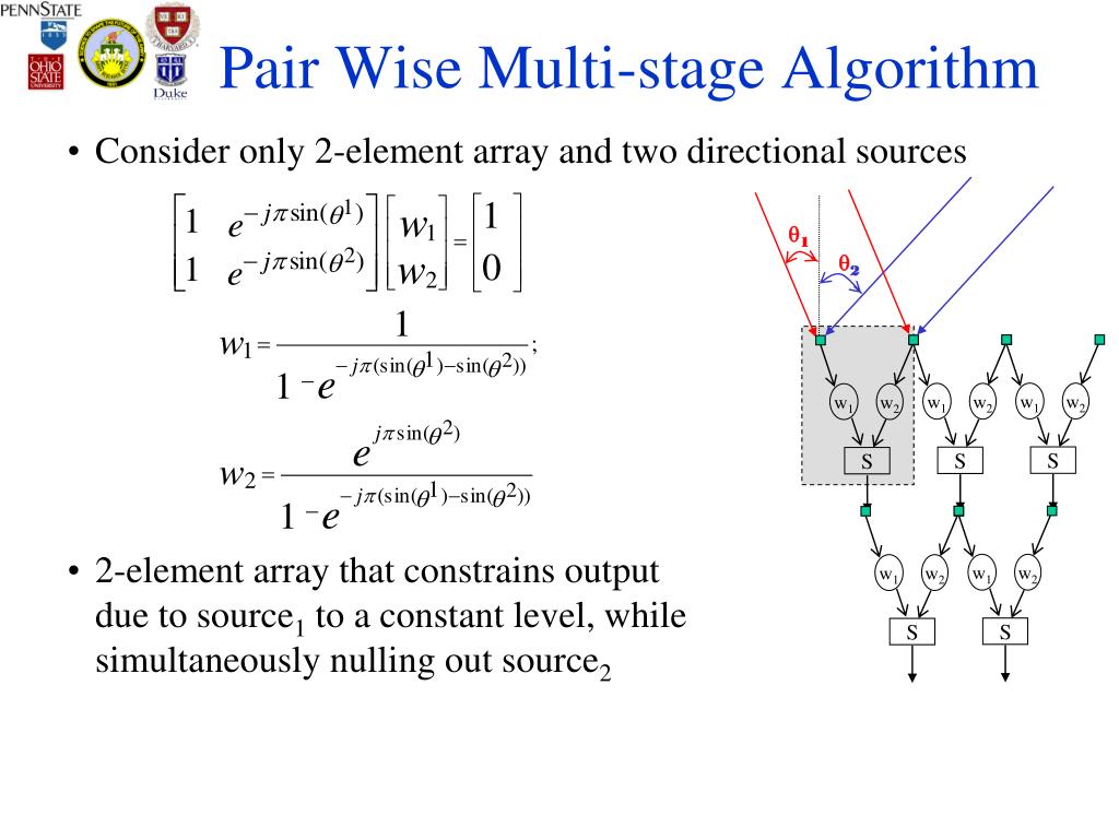 w1 w1 w1 w1 w2 w2 w2 w2 w1 w2 S S S S S Pair Wise Multi-stage Algorithm • Consider only 2-element array and two directional sources q1 q2 • 2-element array that constrains output due to source1 to a constant level, while simultaneously nulling out source2
