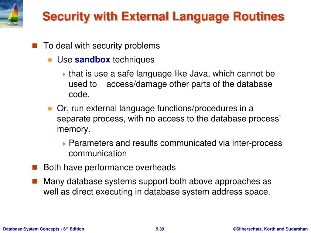 Security with External Language Routines • To deal with security problems • Use sandbox techniques • that is use a safe language like Java, which cannot be used to access/damage other parts of the database code. • Or, run external language functions/procedures in a separate process, with no access to the database process’ memory. • Parameters and results communicated via inter-process communication • Both have performance overheads • Many database systems support both above approaches as well as direct executing in database system address space.