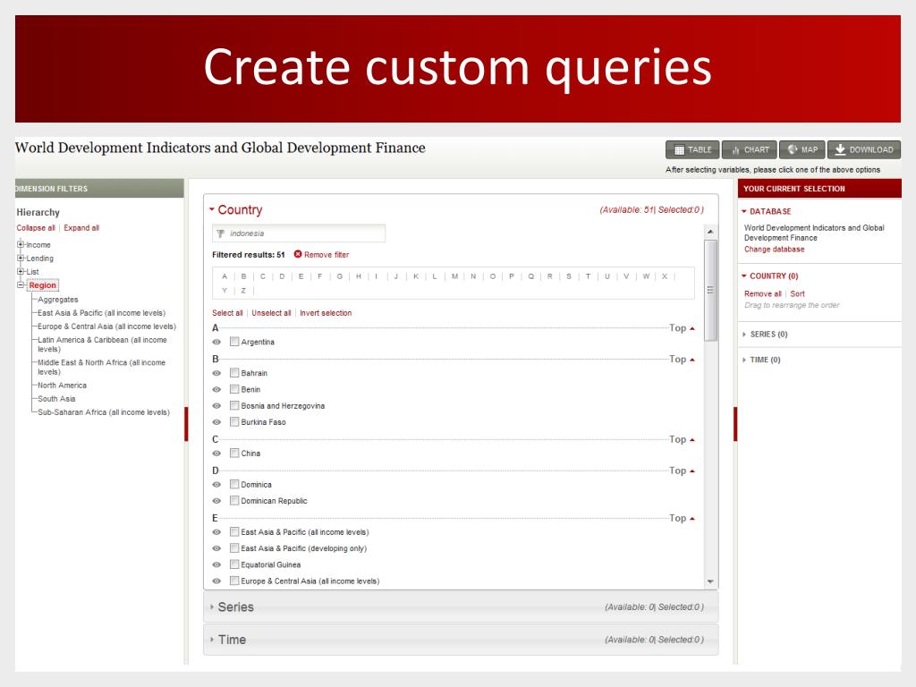Data catalog • One-stop listing of sources • Download entire dataset, access query tool • Global, regional, specialized datasets • 40+ data compilations • 30 datasets included in DataBank, 8000+ indicators • 20 datasets accessible through an API, 5895+ indicators • 1200 indicators in multiple languages