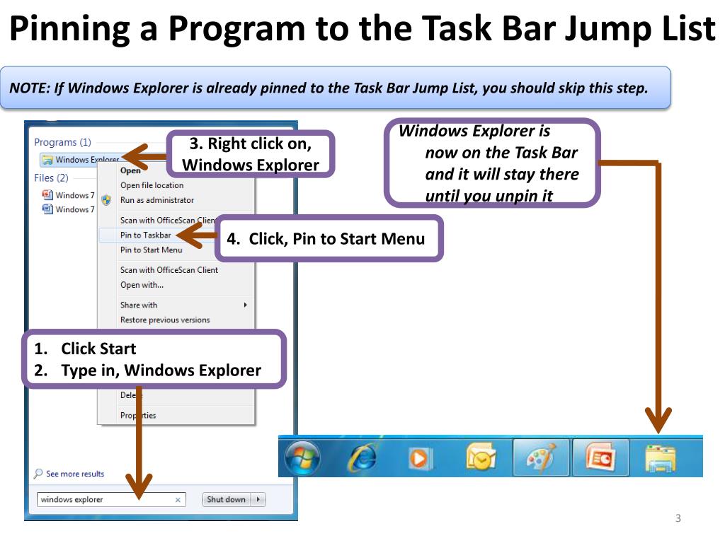 Pinning a Program to the Task Bar Jump List NOTE: If Windows Explorer is already pinned to the Task Bar Jump List, you should skip this step. Windows Explorer is now on the Task Bar and it will stay there until you unpin it 3. Right click on, Windows Explorer 4. Click, Pin to Start Menu Click Start Type in, Windows Explorer