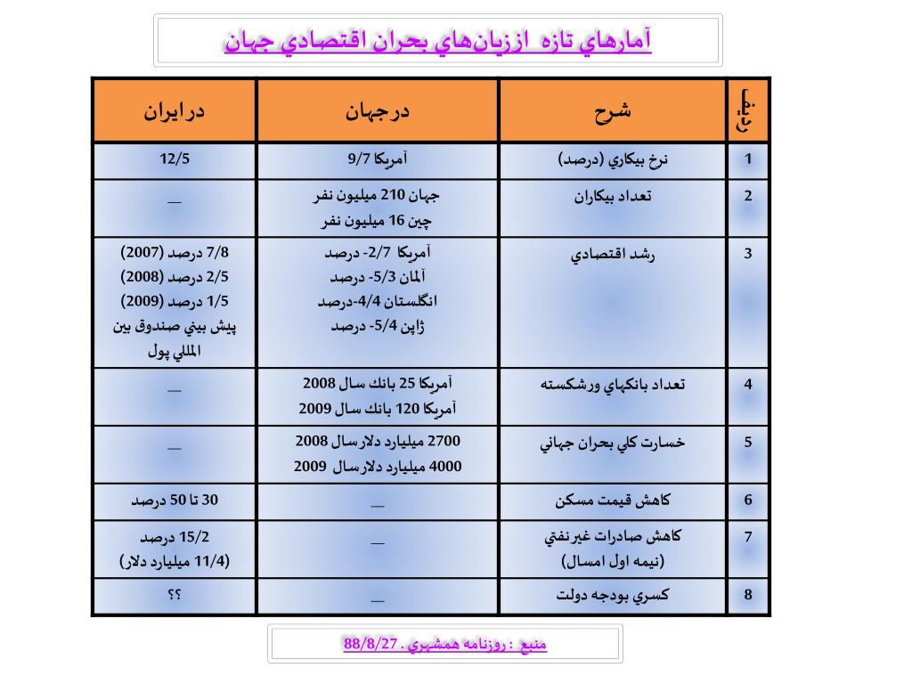 آمارهاي تازهاز زيانهاي بحران اقتصادي جهان منبع: روزنامه همشهري . 88/8/27